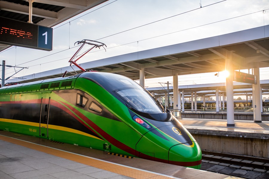 An electric multiple unit (EMU) train of the China-Laos Railway arrives at Yuxi Railway Station in Yuxi, southwest China's Yunnan Province, Dec. 3, 2021. The China-Laos Railway, a flagship project of the Belt and Road Initiative (BRI), started operation on Friday. (Xinhua/Hu Chao)