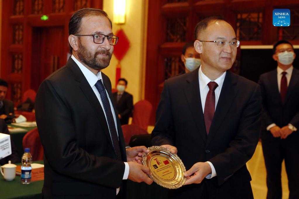 Chinese Ambassador to Pakistan Nong Rong (R, Front) presents an award to a representative of awarded staff during an award ceremony for outstanding Pakistani staff of the China-Pakistan Economic Corridor (CPEC) projects in Islamabad, Pakistan, on Dec. 29, 2021. Pakistan's Minister for Planning, Development and Special Initiatives Asad Umar said on Wednesday that the China-Pakistan Economic Corridor (CPEC) continues to be a flagship project of the overall development strategy of Pakistan. Speaking at an award ceremony for outstanding Pakistani staff of CPEC projects, Umar said that apart from being a vital element for his country's economic development, CPEC is also proving as a cornerstone of the economic relationship between China and Pakistan. (Xinhua/Ahmad Kamal)