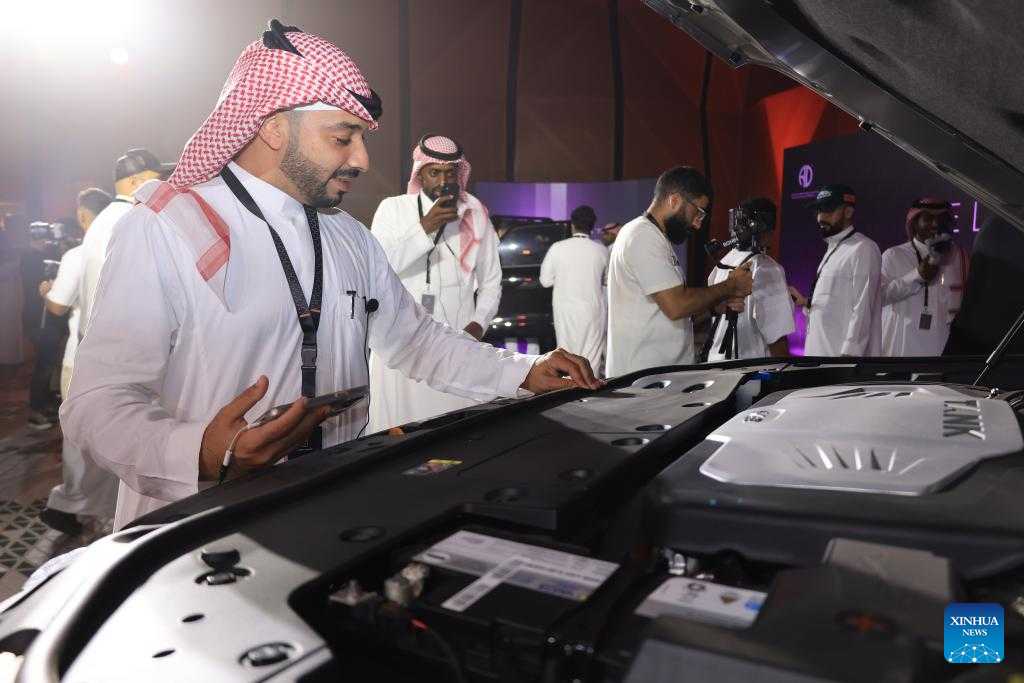 People look at a off-road vehicle displayed at a press conference in Riyadh, Saudi Arabia, on July 3, 2022. Two off-roaders from China's Great Wall Motor Company have made their overseas debut in Riyadh. (Xinhua/Wang Haizhou)