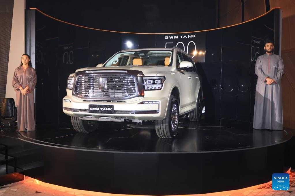 A "Tank 500" off-road vehicle is displayed at a press conference in Riyadh, Saudi Arabia, on July 3, 2022. Two off-roaders from China's Great Wall Motor Company have made their overseas debut in Riyadh. (Xinhua/Wang Haizhou)