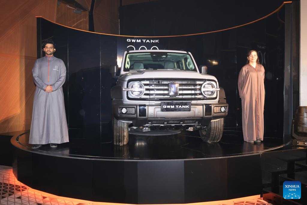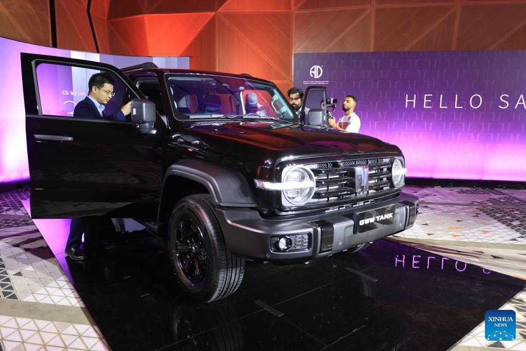A "Tank 300" off-road vehicle is displayed at a press conference in Riyadh, Saudi Arabia, on July 3, 2022. Two off-roaders from China's Great Wall Motor Company have made their overseas debut in Riyadh. (Xinhua/Wang Haizhou)