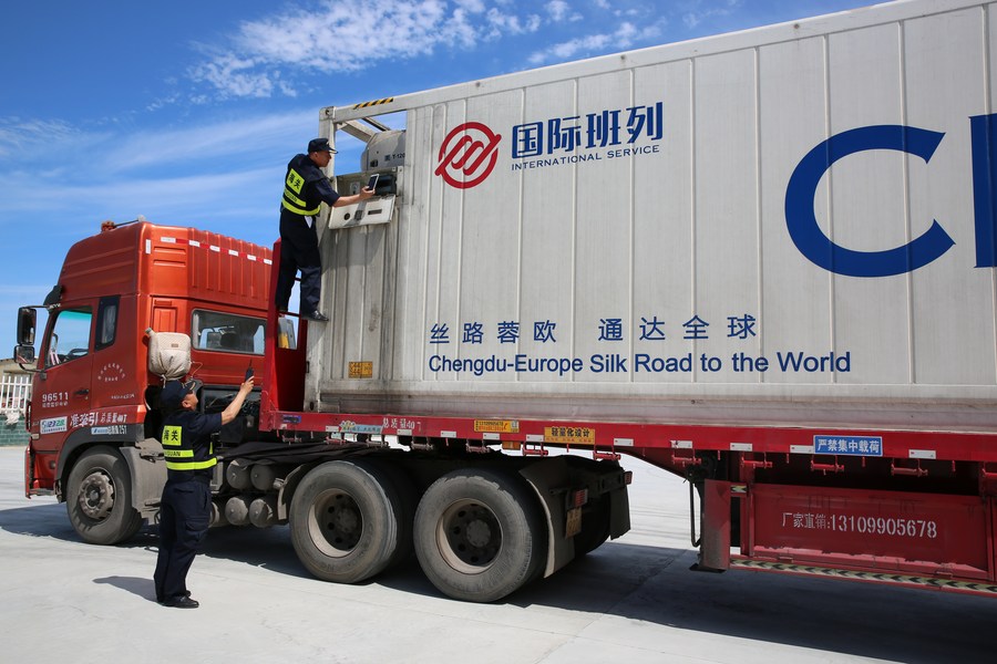 Customs staff check the container at Alashankou port in northwest China's Xinjiang Uygur Autonomous Region, June 6, 2019. (Xinhua/Li Wen)