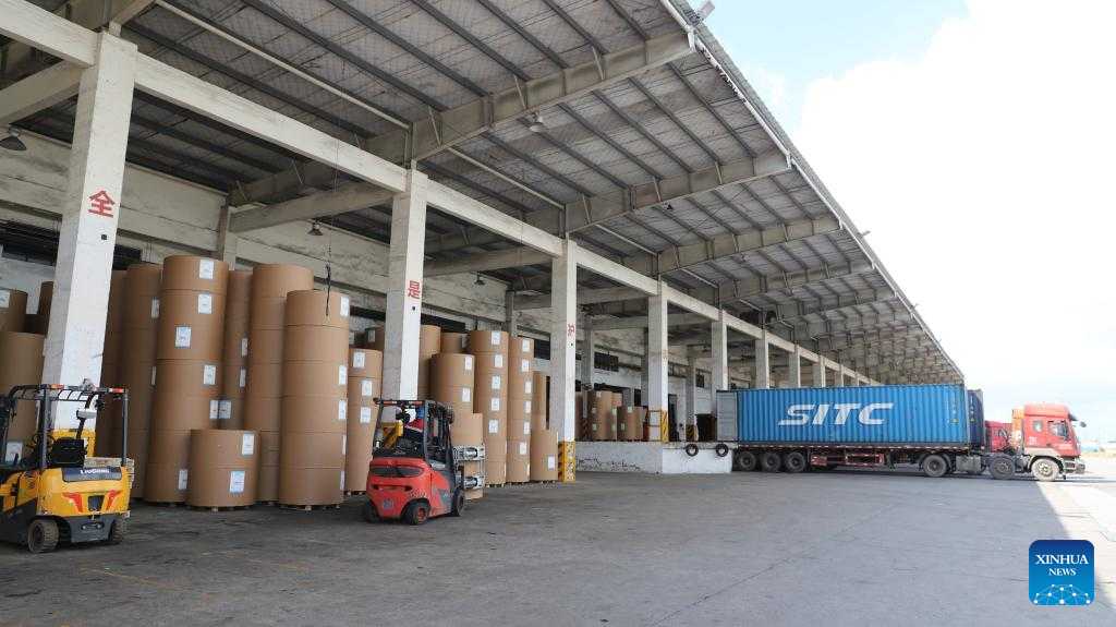 Workers load and ship white cardboard products in the delivery area of a paper factory in south China's Guangxi Zhuang Autonomous Region, July 22, 2022. (Xinhua)