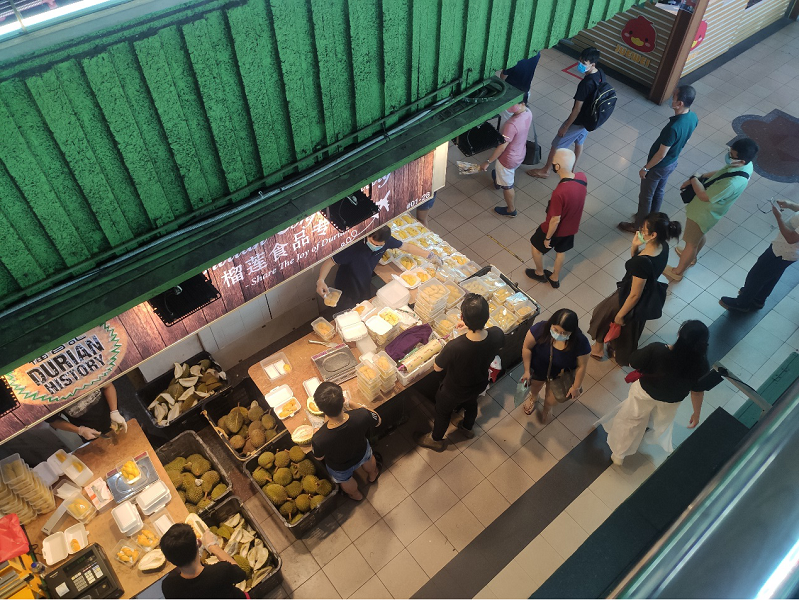 图为6月19日新加坡珍珠大厦底商的榴莲店为客人包装榴莲。(记者李晓渝摄)