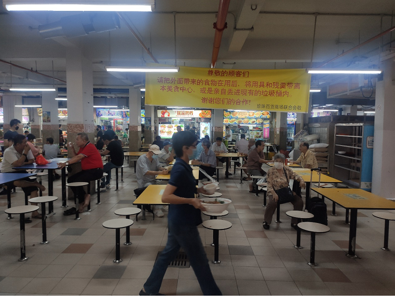 新加坡的小贩中心、咖啡店、餐厅等餐饮场所开放堂食之后,客流明显增加,不过远没有达到满座的水平,很多客人仍旧选择打包食物。记者在人流密集的中巴鲁商场里看到,有些餐厅里的客人不多,服务员和厨师却一直在忙碌。一位服务员告诉记者,他们正处理外卖订单,他还建议记者也通过网络订外卖。