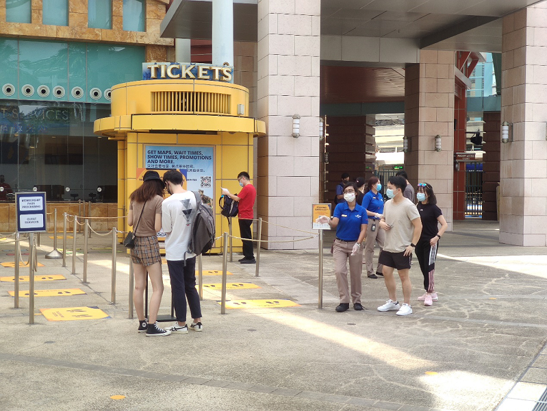 图为7月4日新加坡环球影城售票处前,工作人员引导游客去扫二维码。(记者李晓渝摄)