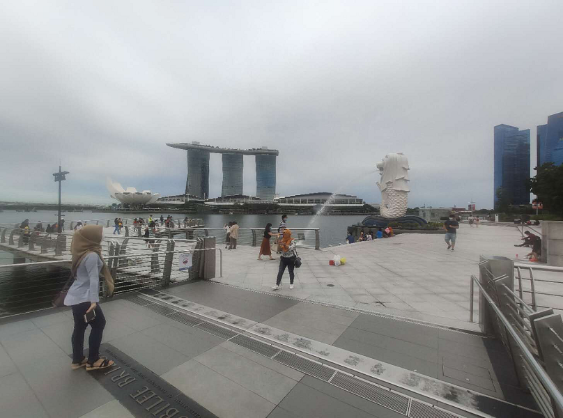 图为6月21日新加坡鱼尾狮公园里,只有为数不多的本地居民在游览拍照。(记者李晓渝摄)