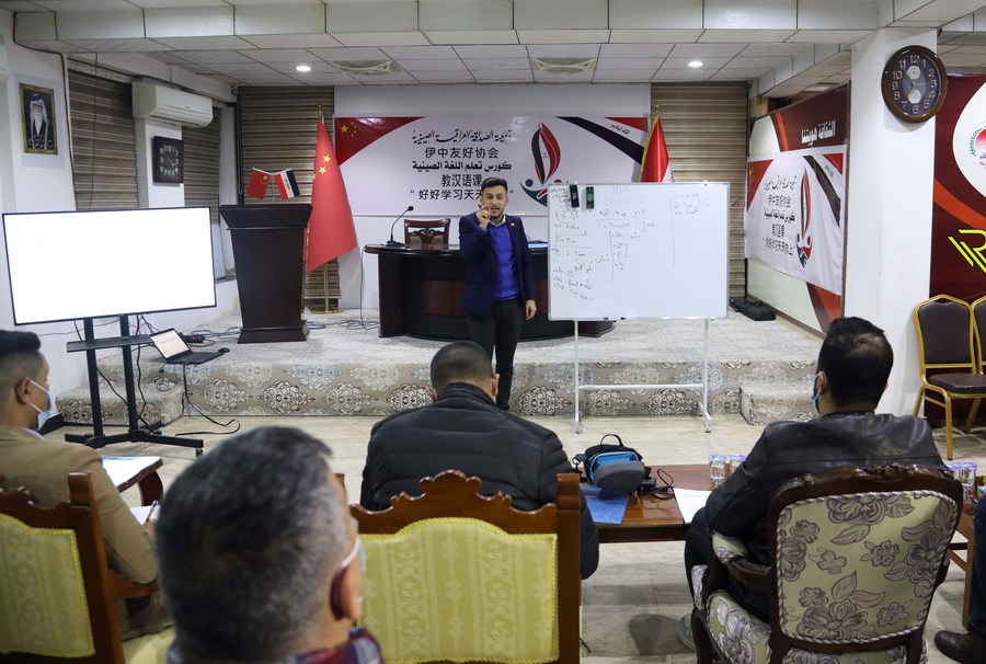 Students attend a class to learn the Chinese language in Baghdad, capital of Iraq, on Dec. 28, 2020. (Xinhua/Khalil Dawood)