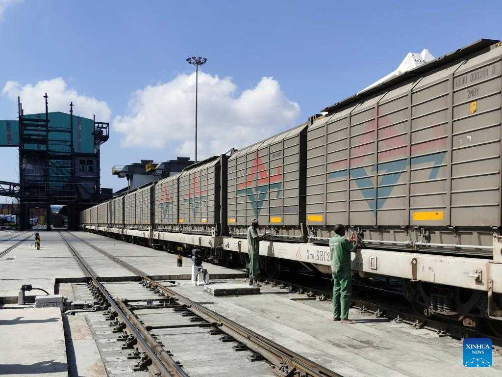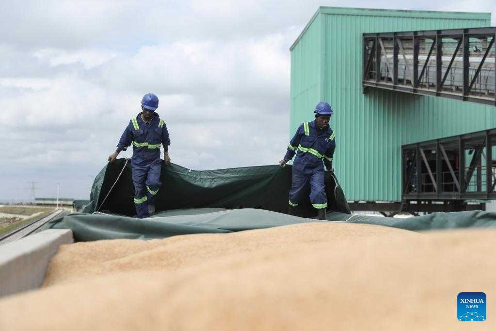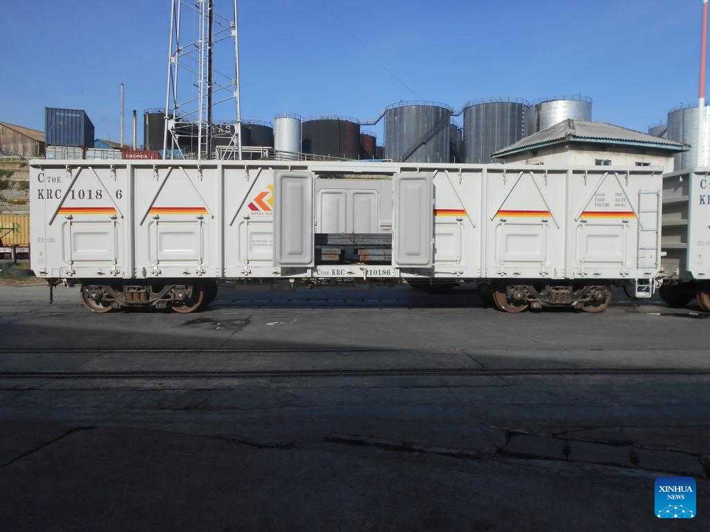 Workers uncover the waterproof cloth covered on grains transported on the bulk grain shipping line of the Grain Bulk Handlers Ltd (GBHL) in Nairobi, Kenya, May 18, 2022. According to data from Afristar, the Mombasa-Nairobi Standard Gauge Railway (SGR) has transported more than 1.7 million TEUs of containers in the last five years. In addition, the Mombasa-Nairobi SGR runs 16 freight trains daily. (Xinhua/Long Lei)