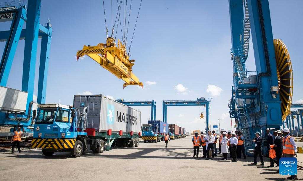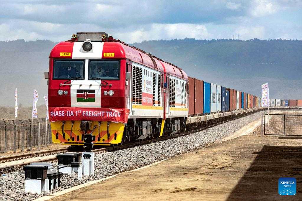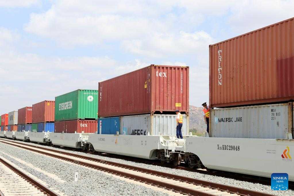The first freight train of the Nairobi-Naivasha Standard Gauge Railway (SGR) arrives at the Naivasha Inland Container Depot in Kenya, on Dec. 17, 2019. The 120km Nairobi-Naivasha railway is an extension of the Chinese-built modern railway that connects Kenya's coastal port city Mombasa to the capital Nairobi. The Mombasa-Nairobi SGR, mainly financed by China and constructed by China Road and Bridge Corporation (CRBC), which began construction in 2014 and finished in 2017. According to data from Afristar, the Mombasa-Nairobi Standard Gauge Railway (SGR) has transported more than 1.7 million TEUs of containers in the last five years. In addition, the Mombasa-Nairobi SGR runs 16 freight trains daily. (Xinhua/Wang Teng)