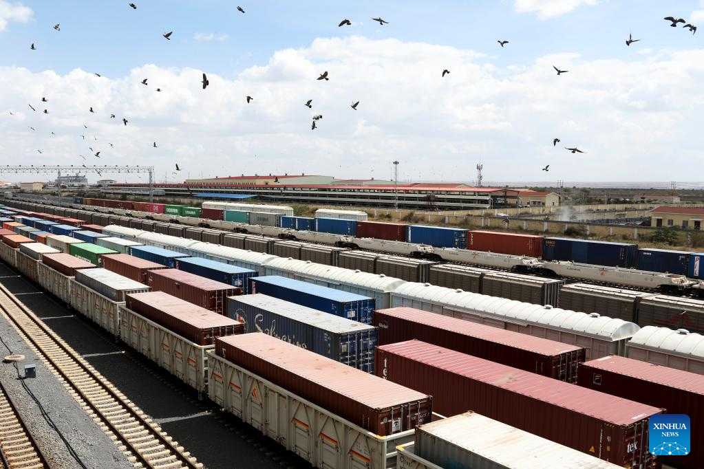 Freight trains are seen at Nairobi station of Mombasa-Nairobi Standard Gauge Railway (SGR) in Nairobi, capital of Kenya, Nov. 17, 2021. According to data from Afristar, the Mombasa-Nairobi Standard Gauge Railway (SGR) has transported more than 1.7 million TEUs of containers in the last five years. In addition, the Mombasa-Nairobi SGR runs 16 freight trains daily. (Xinhua/Dong Jianghui)