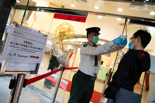 A staff member tests the body temperature of a customer at a branch of Bank of China in Macao, south China, March 2, 2020. (Xinhua/Cheong Kam Ka)