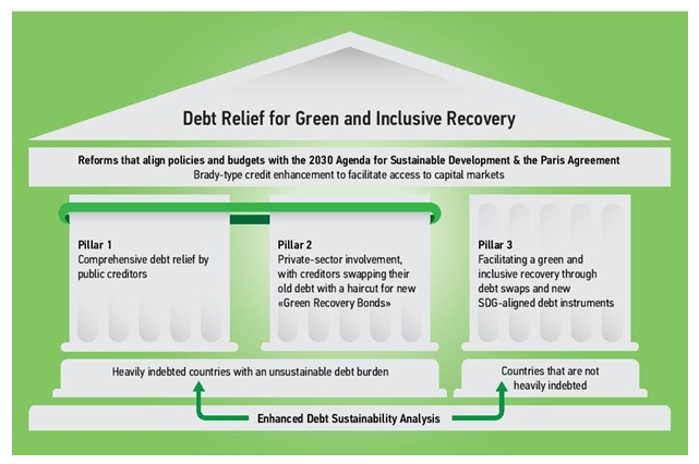 In the third pillar, countries not heavily indebted that have high climate change and development ambitions facing fiscal squeeze under the crisis would be eligible to swap old debt for new SDG- and climate-aligned debt with similar credit enhancement schemes as in pillar 2.