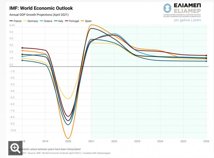 The crucial question now is when will the recovery come and of what size will it be. The shaded area of the chart above presents the latest IMF forecasts. Compared to the corresponding forecasts also presented in this column last October, the IMF projections for most economies are more optimistic in the short term, but more conservative in the long run. This is attributed to the smaller-than-expected recession in the second half of 2020 for most economies, following the temporary easing of restrictive measures and the adjustment of the economies to the labor regime imposed during the pandemic.