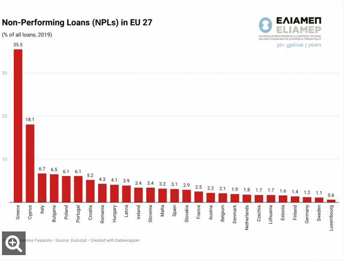 The average percentage of loans in the red for all EU member states, prior to the pandemic, was 4.9% of total loans, with the majority of countries recording a rate lower than the average. Important exceptions were Greece and Cyprus, countries with extremely high rates of NPLs, a fact attributed to the crises they experienced in the last decade. Specifically, as shown in the graph, NPLs in Greece exceeded 35% of total loans, while those in Cyprus ranged around 18%.