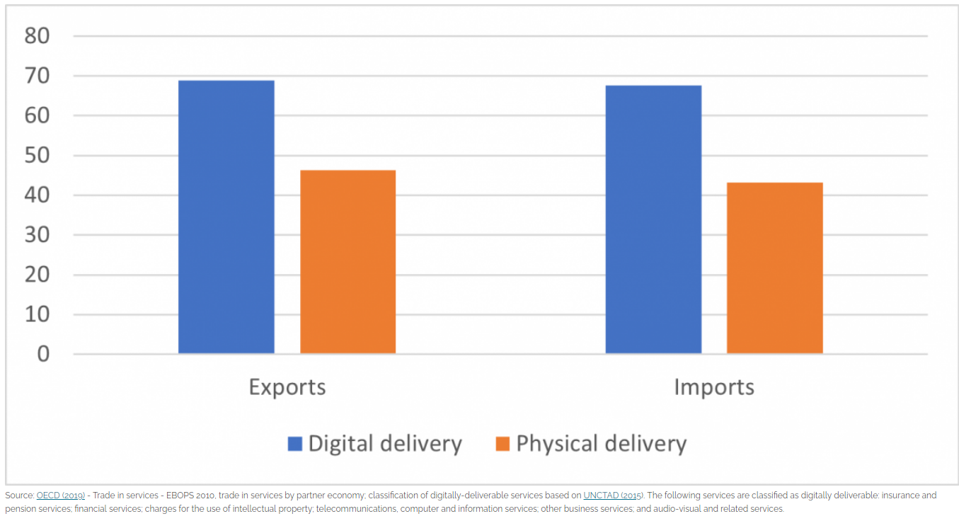 The proliferation of global production networks would not have been possible without a range of services: telecommunication, transportation, financial, etc. Thus, services have always been an important part of GVCs. Yet, during the past decades, trade in services has grown significantly more rapidly than trade in goods, as can be seen in Balance of Payments statistics. Figure 1 shows that trade in services that can potentially be digitally delivered has grown significantly stronger than services that can only be physically delivered (such as tourism or construction). Due to the digital transformation, an increasing number of services can also be easily traded digitally, while the production of services has increasingly become internationally fragmented, e.g. when tax returns are prepared in one country and finalized in another.