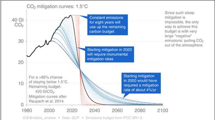 Most climate projections stipulate that even with the most ambitious policy and industry efforts, we will be very hard-pressed to stay within the liveable limits of 1.5°C of global heating. The Global Carbon Project graph captures the scope of this challenge by visualising how steep the curve of mitigation needs to be now (see Figure 1). Mitigation efforts starting in 2020 must drop from 40 GtCO2 to less than half in only five years. It is a monumental transformation.