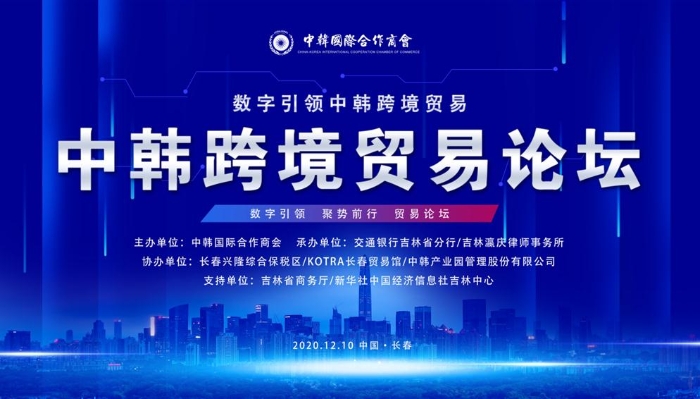 2020年12月10日,为发展跨境电商贸易新业态,推动外贸新增长,以“数字赋能引领中韩跨境贸易”为主题,在吉林省商务厅、新华社中国经济信息社吉林中心支持下,由中韩国际合作商会主办,交通银行吉林省分行、吉林省瀛庆律师事务所承办,长春兴隆综合保税区、Kotra长春贸易馆、中韩产业园管理股份有限公司协办的“吉林省中韩跨境贸易论坛”在吉林省长春市举行。中韩两国于2020年11月15日共同签署加入RCEP,中韩贸易90%以上将实现零关税,此次论坛旨在为众多企业搭建对外沟通交流合作平台,助力中国企业抢占先机,率先开展对韩跨境贸易。中韩国际合作商会衷心邀请相关人士积极参与,为吉林省乃至中国跨境贸易的发展注入新活力。