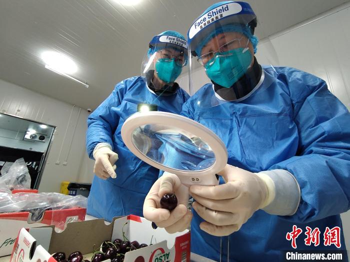 宁波海关关员对进口樱桃进行检验检疫。 王紫 摄
