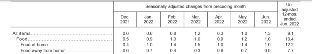 美国劳工部的数据显示,6月美国人在家就餐价格同比上涨12.2%,外出就餐价格同比也上涨10.4%。当月,6种主要食品类别价格中有5种有所上升。