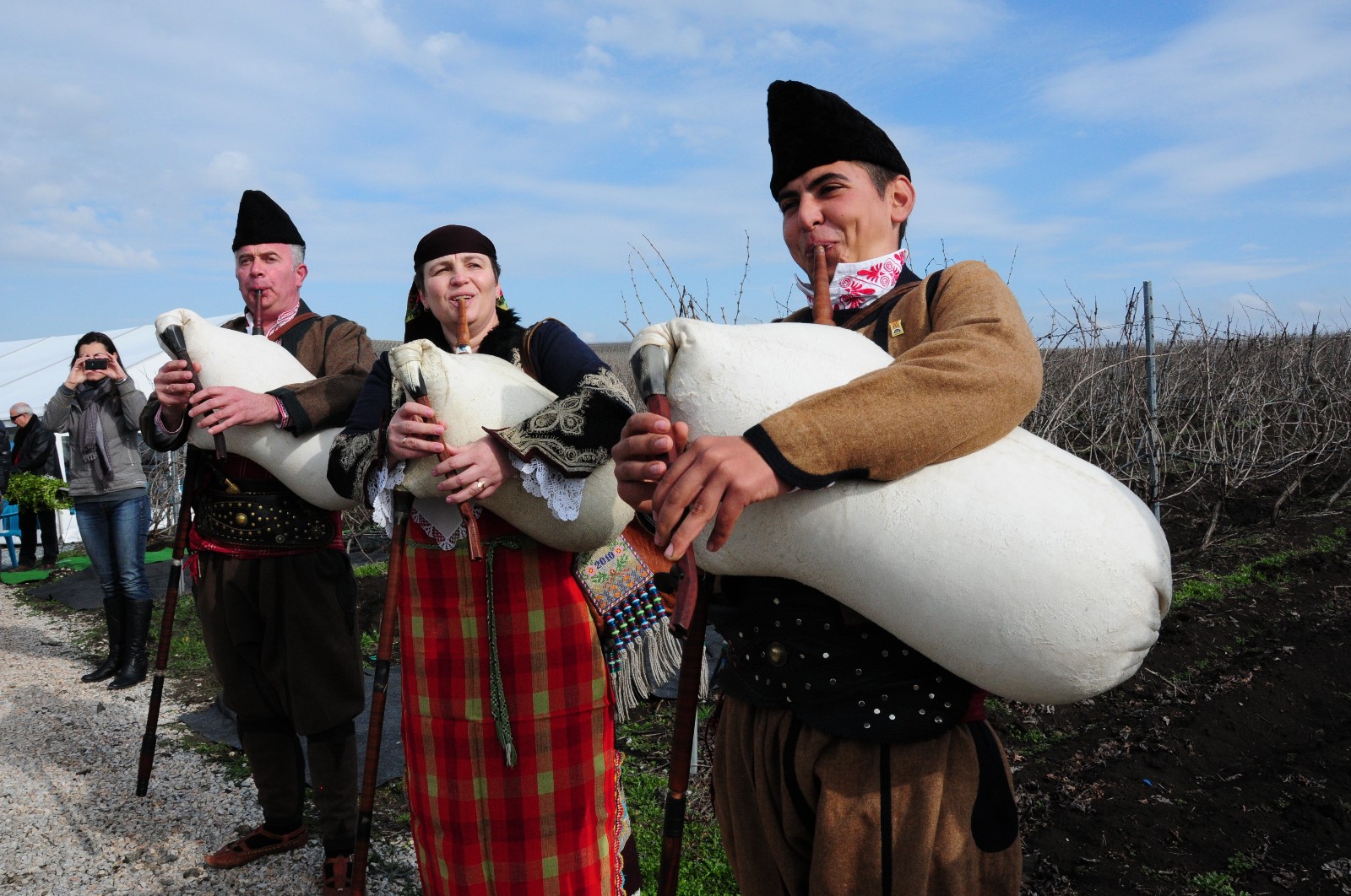 2014年2月14日,保加利亚中东部城市扬博尔郊区的一座葡萄园,人们吹奏当地民族乐器,欢庆葡萄剪枝节。陈航/新华社