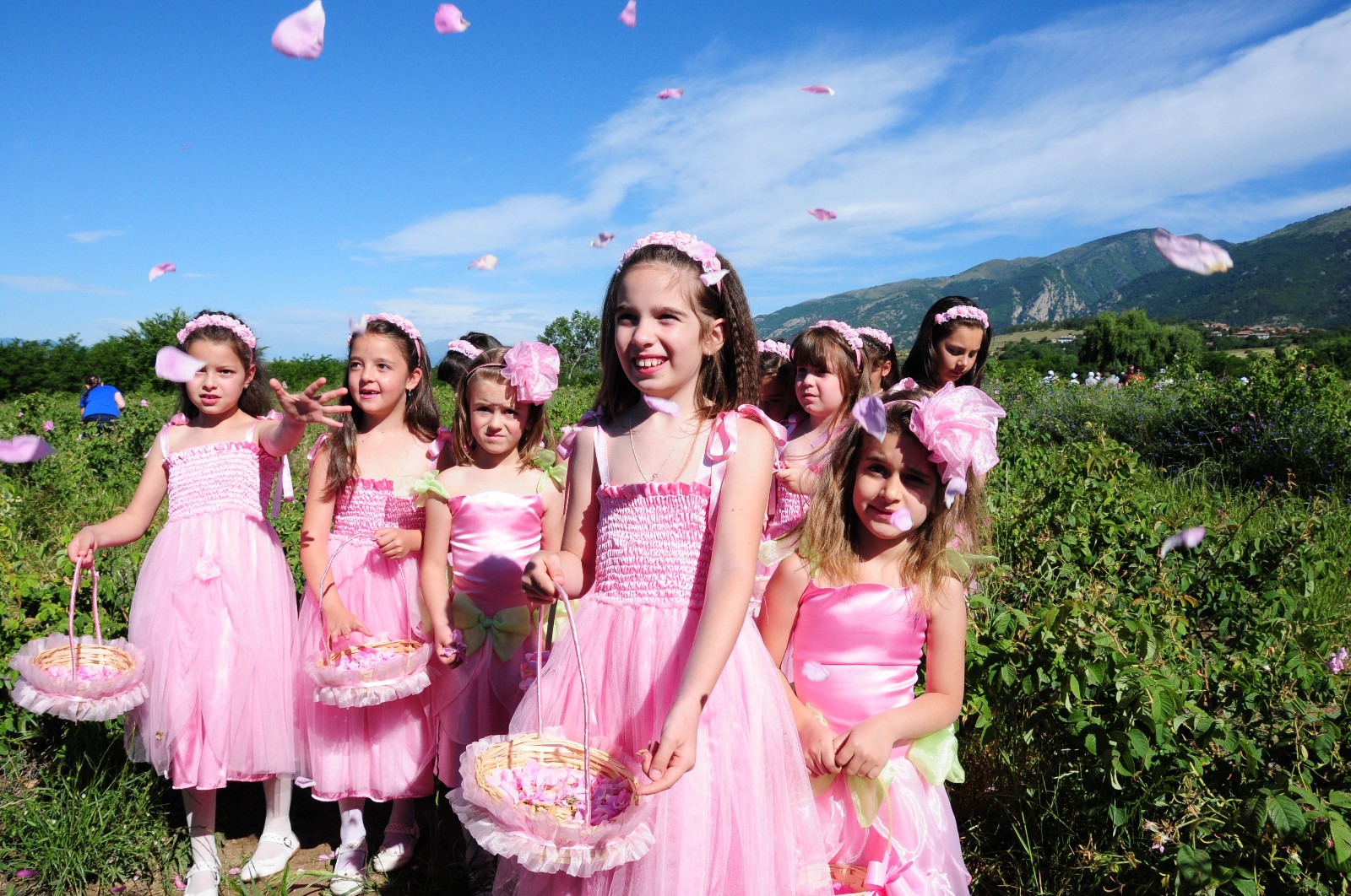2013年6月1日,保加利亚卡尔洛沃市市郊一处玫瑰园,身着粉色礼服的小姑娘在抛洒玫瑰花瓣,庆祝第110届玫瑰节。陈航/新华社
