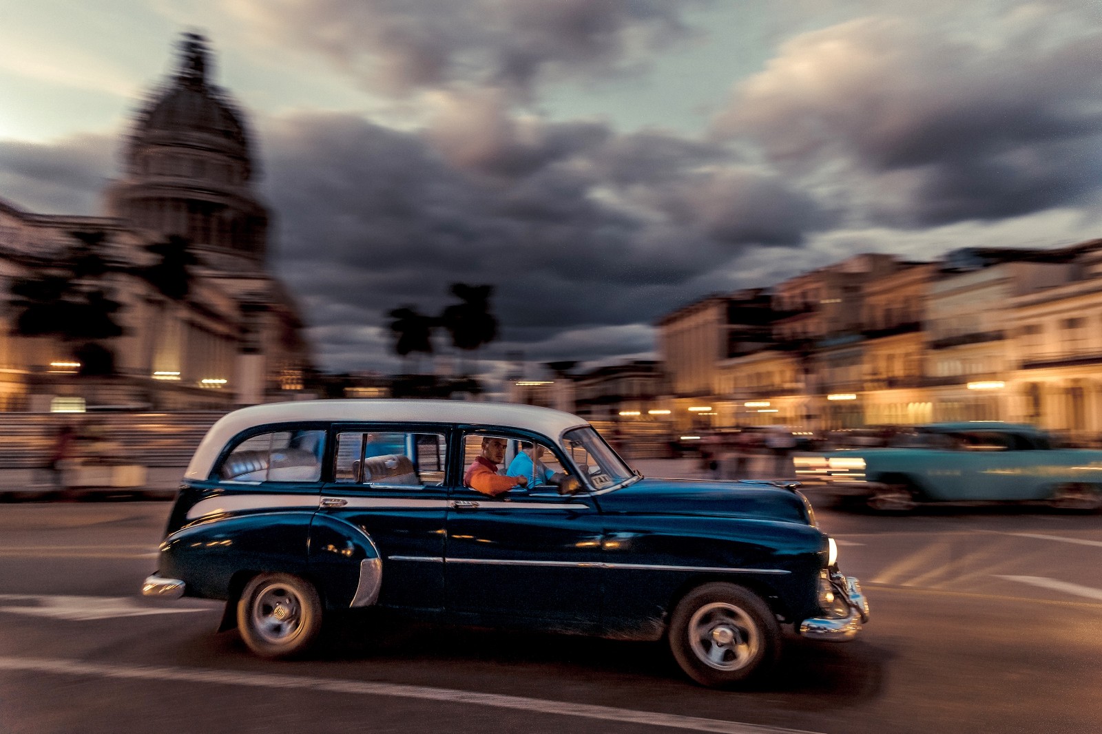 2014年10月25日,古巴首都哈瓦那,一辆20世纪40年代生产的雪佛兰轿车驶过老城区。作为古巴主要交通运力之一,老爷车成为游客眼中一道独特风景线。刘彬/新华社