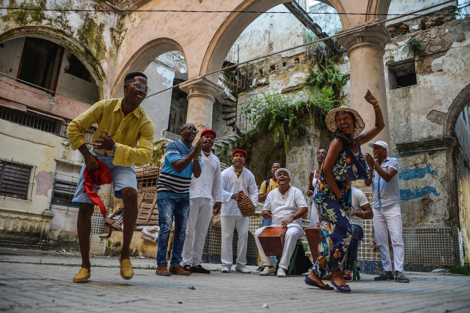 2018年8月22日,古巴哈瓦那街头,一对表演者在街头跳起伦巴舞。新华社/法新