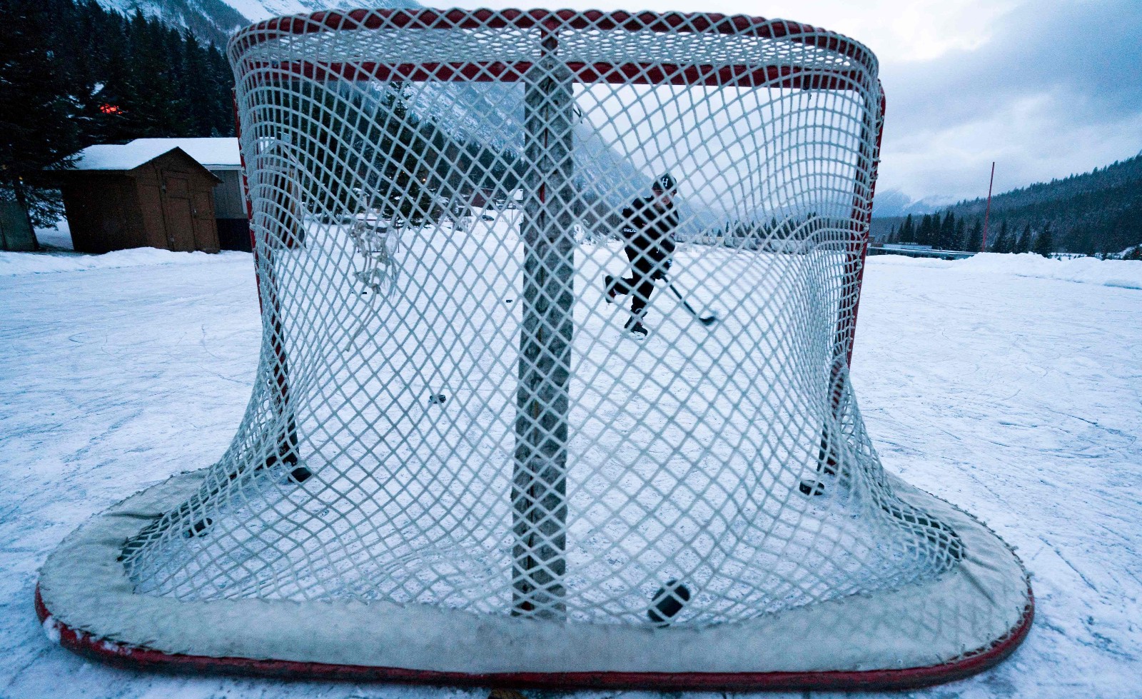 2017年11月30日,加拿大不列颠哥伦比亚省菲尔德,一位小伙子在溜冰场上练习冰球射门。新华社/法新