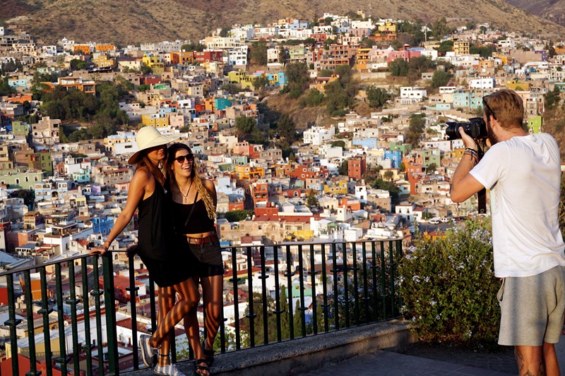 2017年5月19日,墨西哥中部古城瓜纳华托,游客在皮皮拉山拍照留念。伍婧丹/新华社