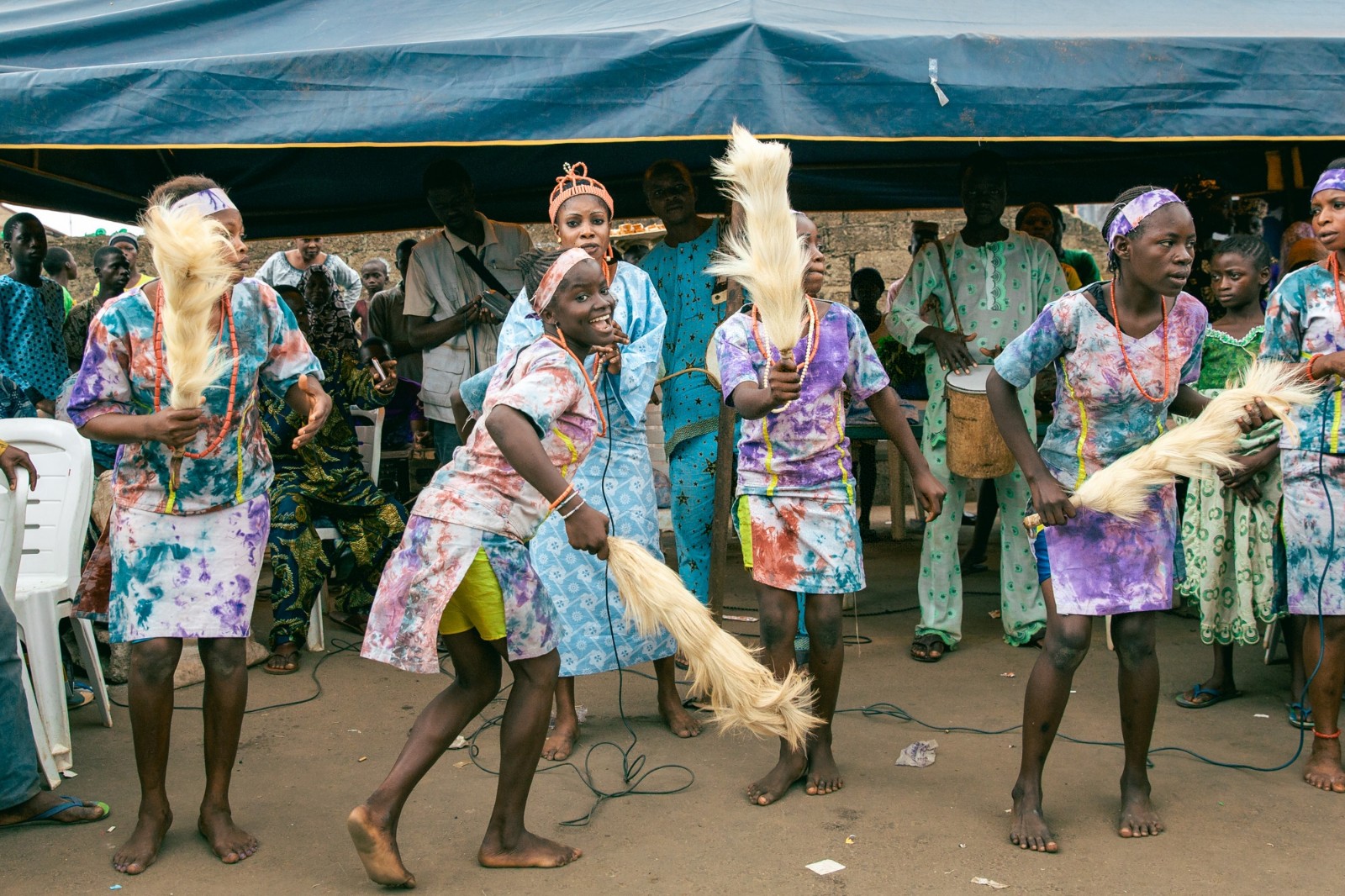 2013年8月23日,尼日利亚奥孙州的奥索博,几名女孩在街市上欢快地跳舞,庆祝“河神节”。“河神节”是约鲁巴人最重要的文化象征之一。节日期间,人们身着盛装,击打着热情的鼓点,踩着摇曳的舞步,成群结队地向林中进发,进行祈祷,企求一年好运。新华社发(张唯一摄)
