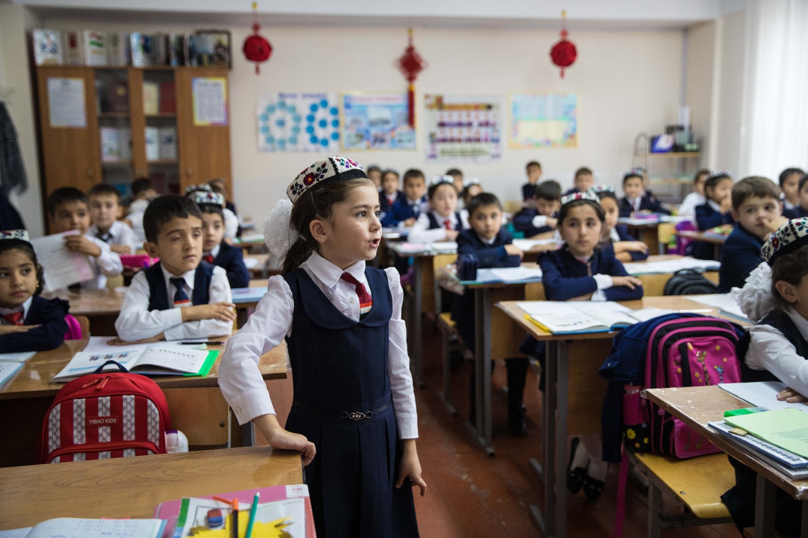 2018年10月10日,塔吉克斯坦首都杜尚别,学生在杜尚别101学校内上课。杜尚别101学校是由中国特变电工股份有限公司出资援建的四所“中塔友谊学校”之一,学校的建成解决了塔国教育资源、教育场地极度短缺的问题,成为中塔友谊的象征。吴壮/新华社