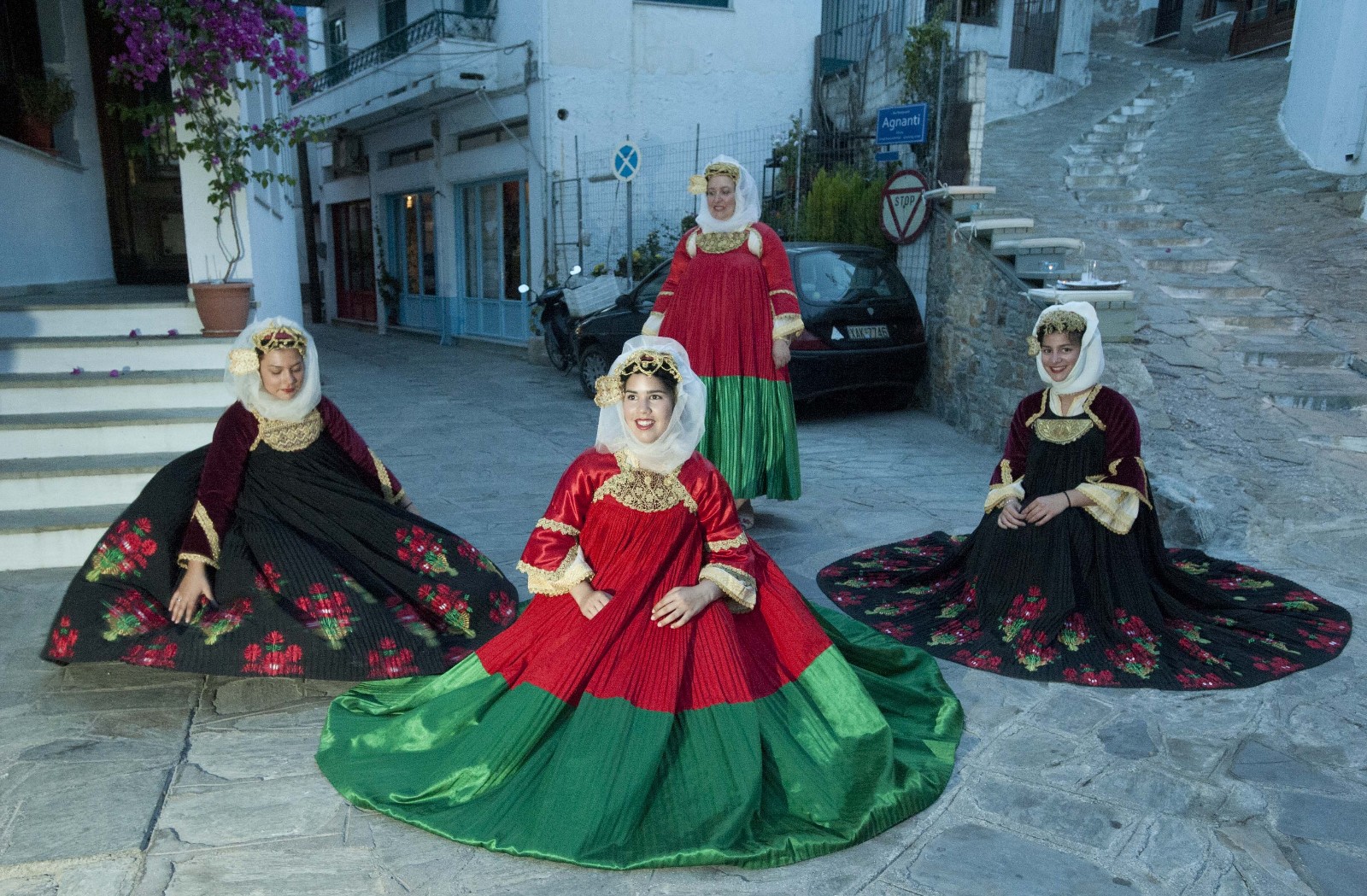 2014年6月15日,希腊首都雅典东北约270公里爱琴海西部岛屿斯戈皮罗斯,身着传统服装的妇女们在街道上迎接游客。斯戈皮罗斯传统妇女服装为最有特色的希腊传统服装,大红裙身配绿色裙边的表示正在热恋,黑底红花的为新娘服装。刘咏秋/新华社