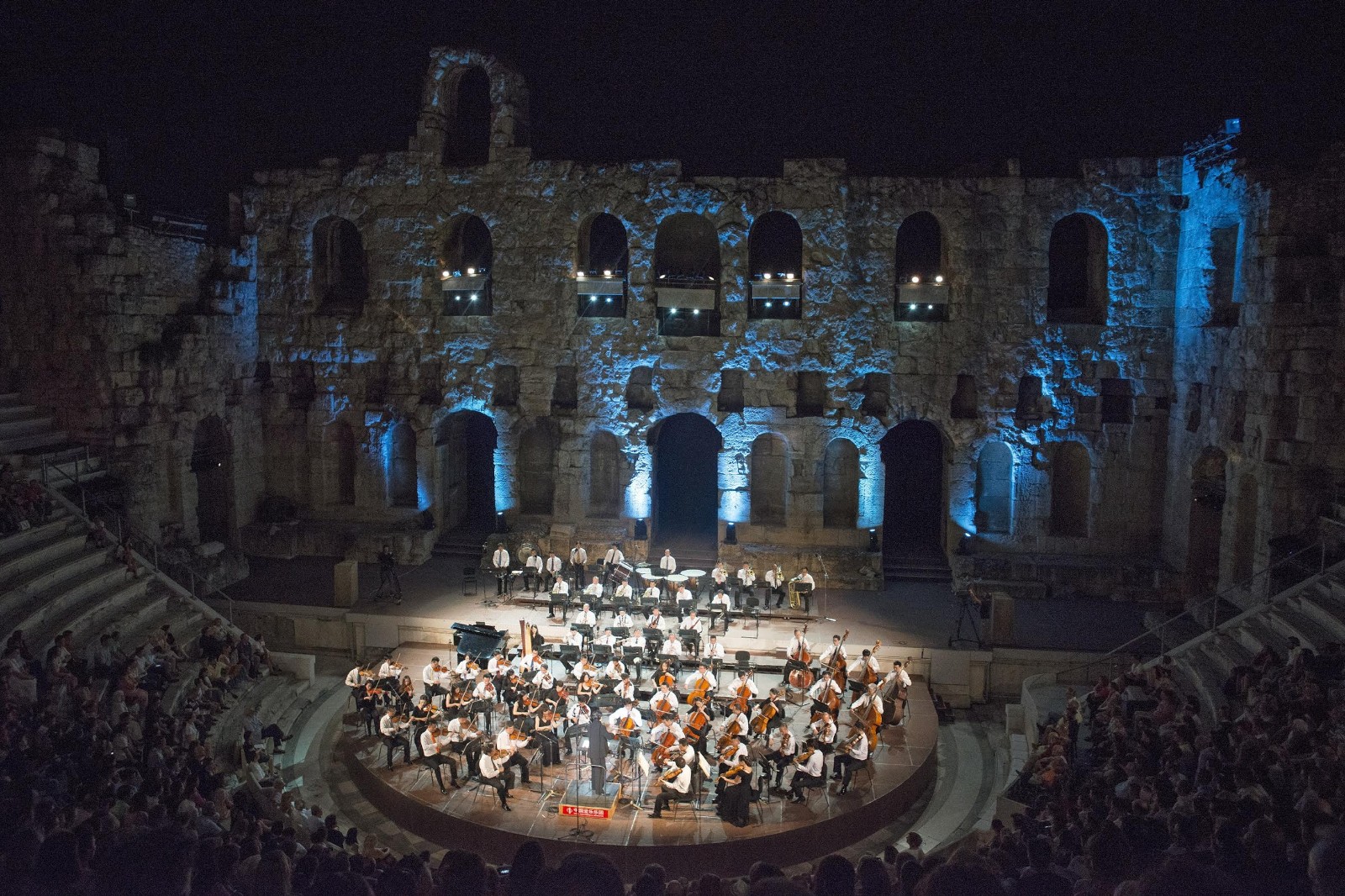 2015年8月19日,希腊首都雅典阿迪库斯剧场,中国爱乐乐团举行“2015丝绸之路巡演”最后一场演出。(新华社发)