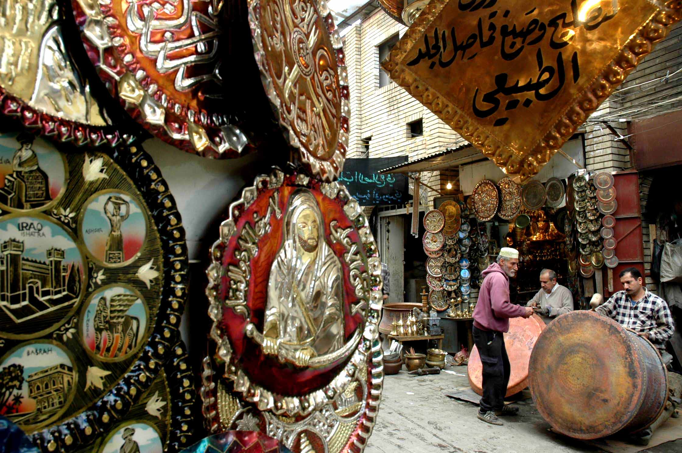 2005年3月14日,伊拉克首都巴格达市中心,西法菲亚市场上精美的铜质工艺品。西法菲亚市场有着上百年的历史,汇集了各种伊拉克传统的手工艺人,是巴格达最大、最繁华的百货市场。申宏/新华社