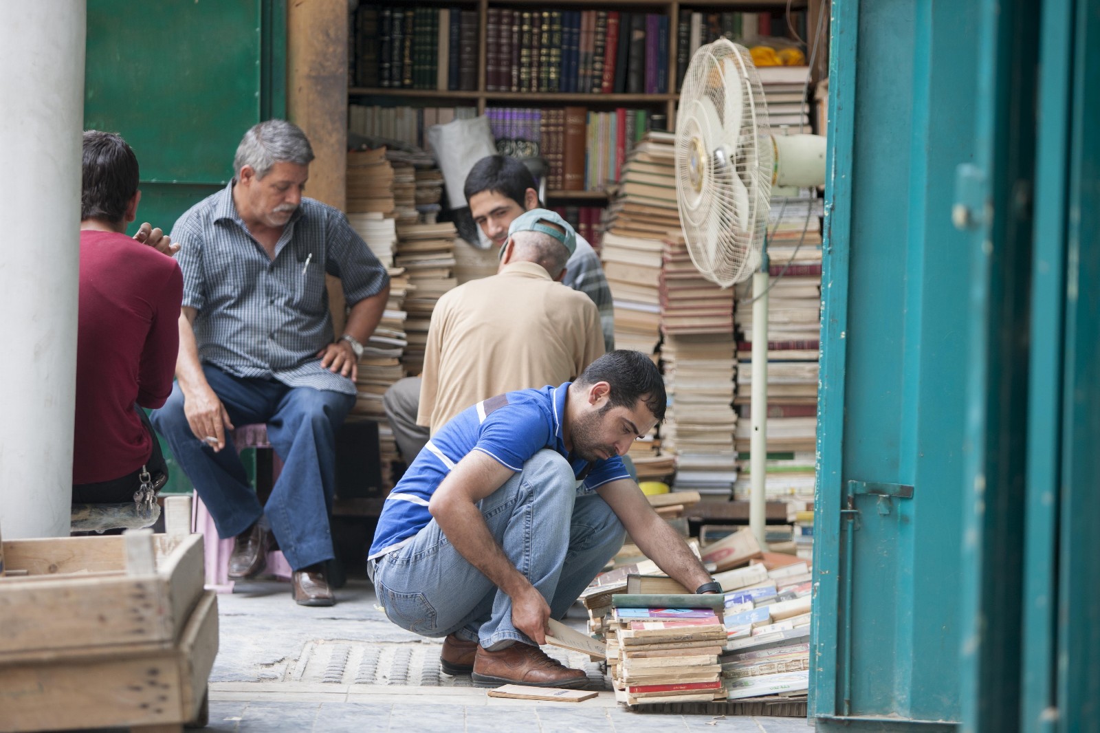 2014年4月27日,伊拉克首都巴格达,读者在穆塔纳比书市的地摊上阅读挑选图书。崔新钰/新华社