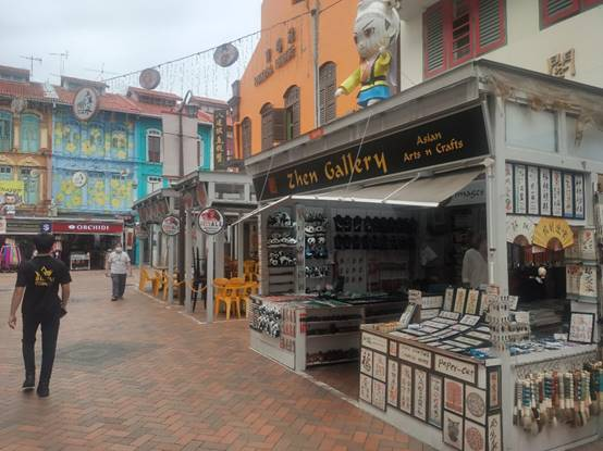 8月6日,在新加坡唐人街牛车水的步行街上,行人路过销售旅游纪念品的商铺(新华社记者 李晓渝 摄)