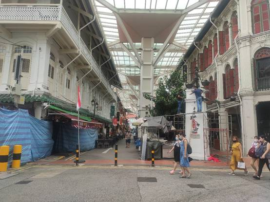 8月6日,行人路过部分店面停业装修的新加坡牛车水美食街(新华社记者 李晓渝 摄)