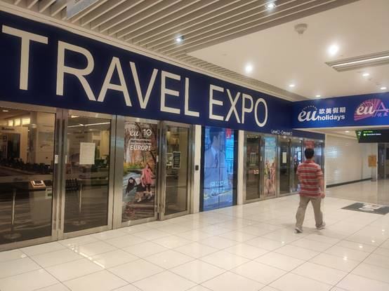 8月6日,新加坡新达城购物中心里的一家旅行社大门紧闭(新华社记者 李晓渝 摄)