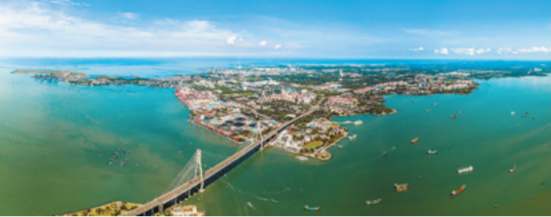 10月2日在海南儋州拍摄的洋浦大桥对岸的海南洋浦经济开发区(无人机全景照片)。新华社记者 蒲晓旭摄